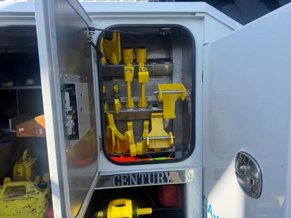 Pete 389 Extended cab. ISX15 565 HP Fuller RTLO16918B 18 Speed. .20,000 lb, 3.5in Drop, 20.000lb Front suspension. 26 in Aluminum 135 Gallon Fuel Tank LH U/C, DEF Tank Small, Alum Cab 123in BBC Alum Hood SFFA, 10-3/4in Steel Rails 403-444in.Full Steel Inner Liner.Heavy-Duty Iron Front Spring Brackets Fwd & Rear.Dana Spicer 46,000 lb, Ratio 3.91 Rear Axle. Diff Lock Both Axles. SBM Valve. Synthetic Axle Lubricant All Axles.Neway ADZ252 52,000 lbs, 54in -Dual Leveling Valves Bendix AD-IS Air Dryer with Heater. Polished Alum Air Tanks Outside Frame Rails.Aluminum Space Saver Battery Box LH BOC.DPF Cab Entry Aluminum Non-Slip Step RH Under Cab. Heavy Duty External Tow Eye. Intebrake (Furnished on Engine).(2) 13in SS Air Cleaners, Cowl Mtd, SS Caps. Thermal Insulation Package in Cab.Thermal Insulation Pkg - Adjustable Steering Column - Tilt/Telescope.Leather Steering Wheel. Platinum Interior - Grey . Power Lift Windows - Both Doors. Combo Fresh Air Heater/Air Conditioner. Cup Holder (Floor Mounted).Outside Sunvisor Stainless Steel. Aero Mirrors Ea Side Htd & Mtrzd 4-Way Adjustable. (4) Air Horns Rect-(2) 26in & (2) 29in. ConcertClass Audio System with CD. Bright Bezel Gauges ipo Black. Marker Lights (5) Bus LED Bullet. Fog Lights (2) Peterbilt. (1) 6in Spotlight Round Halogen LH.345" Wheelbase. Suspension Pressure Gauge. Stainless Steel Gravel Guards. 10 Inch Extension for Ultra Day Cab. Air Disc brake package. Diff. Lock Tandem Axles with speed Inte. RLOCK -Upgrade Clutch Torque Capacity. Peterbilt Keyless Entry, Platinum Interior - Arctic Gray, with SmartNav. Rubber Floor ipo Carpet (Black Only)., Cobra 40 Channel CB Radio w/Integral Speaker, Unibilt Cab Air Suspension. (2) Peterbilt Fog Lights. : Pusher axle Tire. (4) BR 14ply 285/75R24.5 M726ELA 2,679 540, Front tires.: MN 20ply 385/65R22.5 X Multiway HD XZE. RR: BR 16ply 11R24.5 M726ELA, (1) non-steerable pusher axle. 345" Wheelbase. 86,600 GVWR Keyless entryCentury 1140