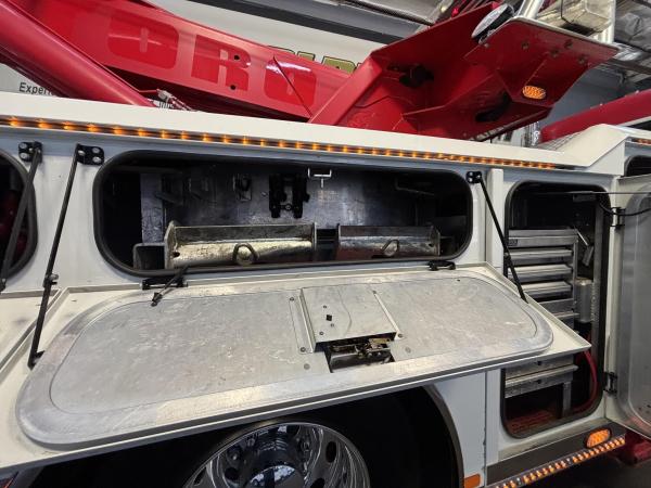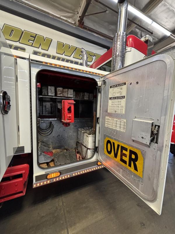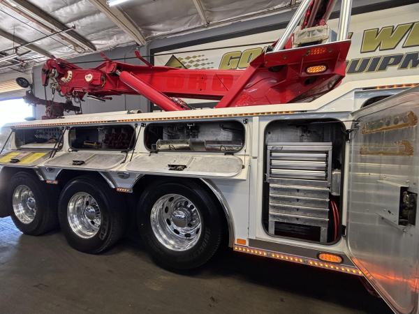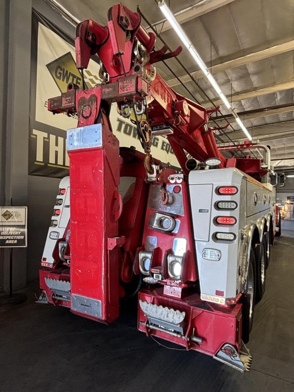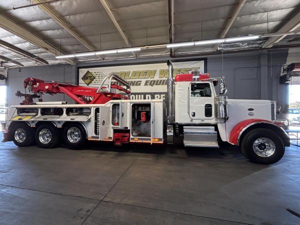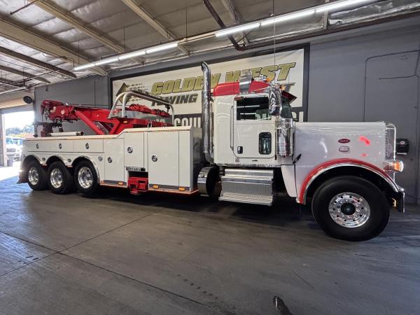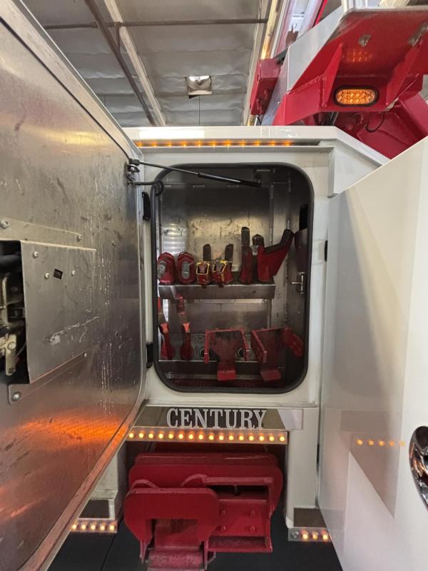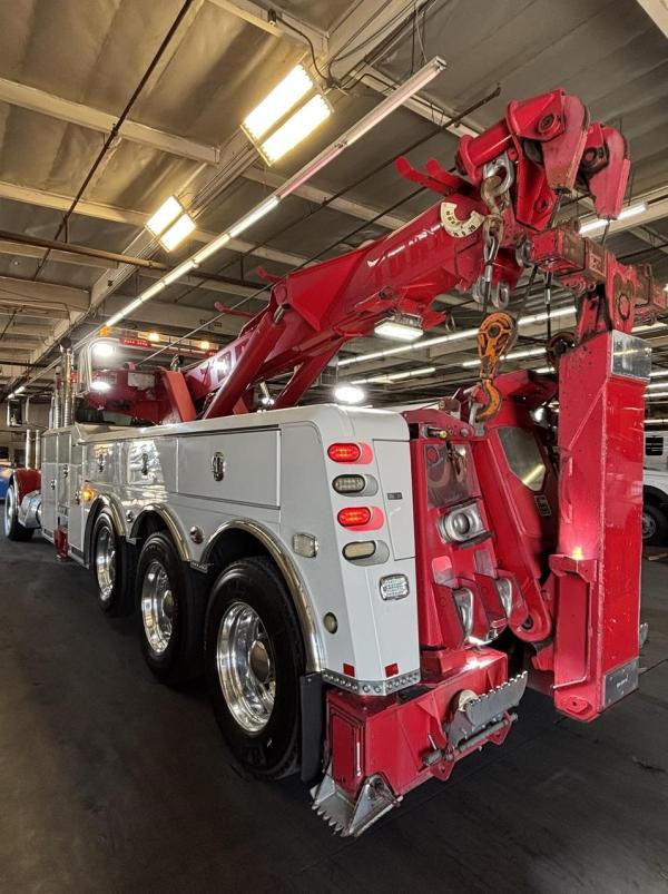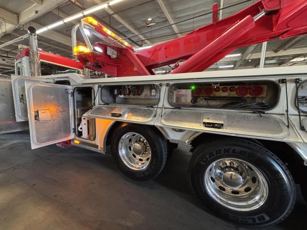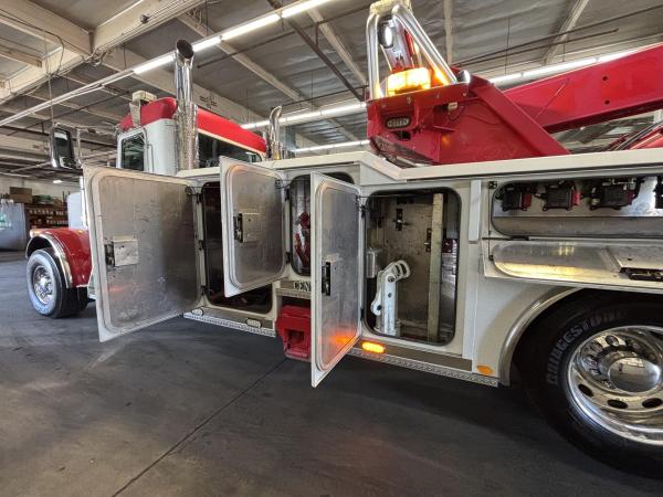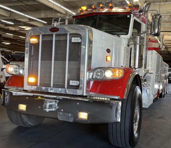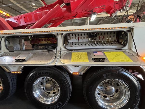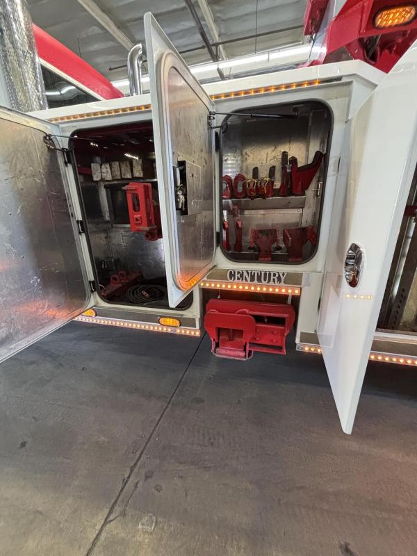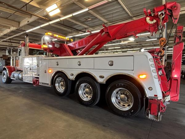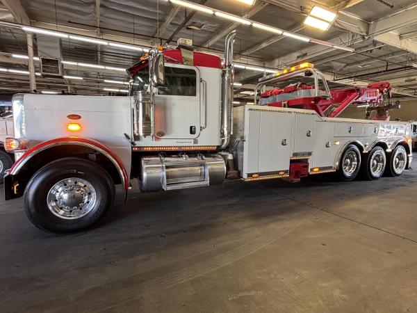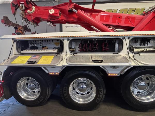 Pete 389 Extended cab. ISX15 550 HP Fuller RTLO16918B 18 Speed. .20,000 lb, 3.5in Drop, 20.000lb Front suspension. 26 in Aluminum 135 Gallon Fuel tank RH-135 Gallon Fuel Tank LH U/C, DEF Tank Small, Alum Cab 123in BBC Alum Hood SFFA, 10-3/4in Steel Rails 403-444in.Full Steel Inner Liner.Heavy-Duty Iron Front Spring Brackets Fwd & Rear.Dana Spicer 46,000 lb, Ratio 4.30 Rear Axle. Diff Lock Both Axles. SBM Valve. Synthetic Axle Lubricant All Axles.46,000lb Air Trac Pete Air ride., 54in -Dual Leveling Valves Bendix AD-IS Air Dryer with Heater. Polished Alum Air Tanks Outside Frame Rails.Aluminum Space Saver Battery Box LH BOC.DPF Cab Entry Aluminum Non-Slip Step RH Under Cab. Heavy Duty External Tow Eye. Intebrake (Furnished on Engine).(2) 13in SS Air Cleaners, Cowl Mtd, SS Caps. Thermal Insulation Package in Cab.Thermal Insulation Pkg - Adjustable Steering Column - Tilt/Telescope.Leather Steering Wheel. Platinum Interior - Grey . Power Lift Windows - Both Doors. Combo Fresh Air Heater/Air Conditioner. Cup Holder (Floor Mounted).Outside Sunvisor Stainless Steel. Aero Mirrors Ea Side Htd & Mtrzd 4-Way Adjustable. (4) Air Horns Rect-(2) 26in & (2) 29in. ConcertClass Audio System with CD. Bright Bezel Gauges ipo Black. Marker Lights (5) Bus LED Bullet. Fog Lights (2) Peterbilt. (1) 6in Spotlight Round Halogen LH. Suspension Pressure Gauge. Stainless Steel Gravel Guards. 10 Inch Extension for Ultra Day Cab. Air Disc brake package. Diff. Lock Tandem Axles with speed Inte. RLOCK -Upgrade Clutch Torque Capacity. Peterbilt Keyless Entry, Platinum Interior - Arctic Gray, with SmartNav. Rubber Floor ipo Carpet (Black Only)., Cobra 40 Channel CB Radio w/Integral Speaker, Unibilt Cab Air Suspension. (2) Peterbilt Fog Lights. : Pusher axle Tire. (4) BR 14ply 285/75R24.5 M726ELA 2,679 540, Front tires.: MN 20ply 385/65R22.5 X Multiway HD XZE. RR: BR 16ply 11R24.5 M726ELA, (1) non-steerable pusher axle. 345" Wheelbase. 86,600 GVWRCentury 1140R