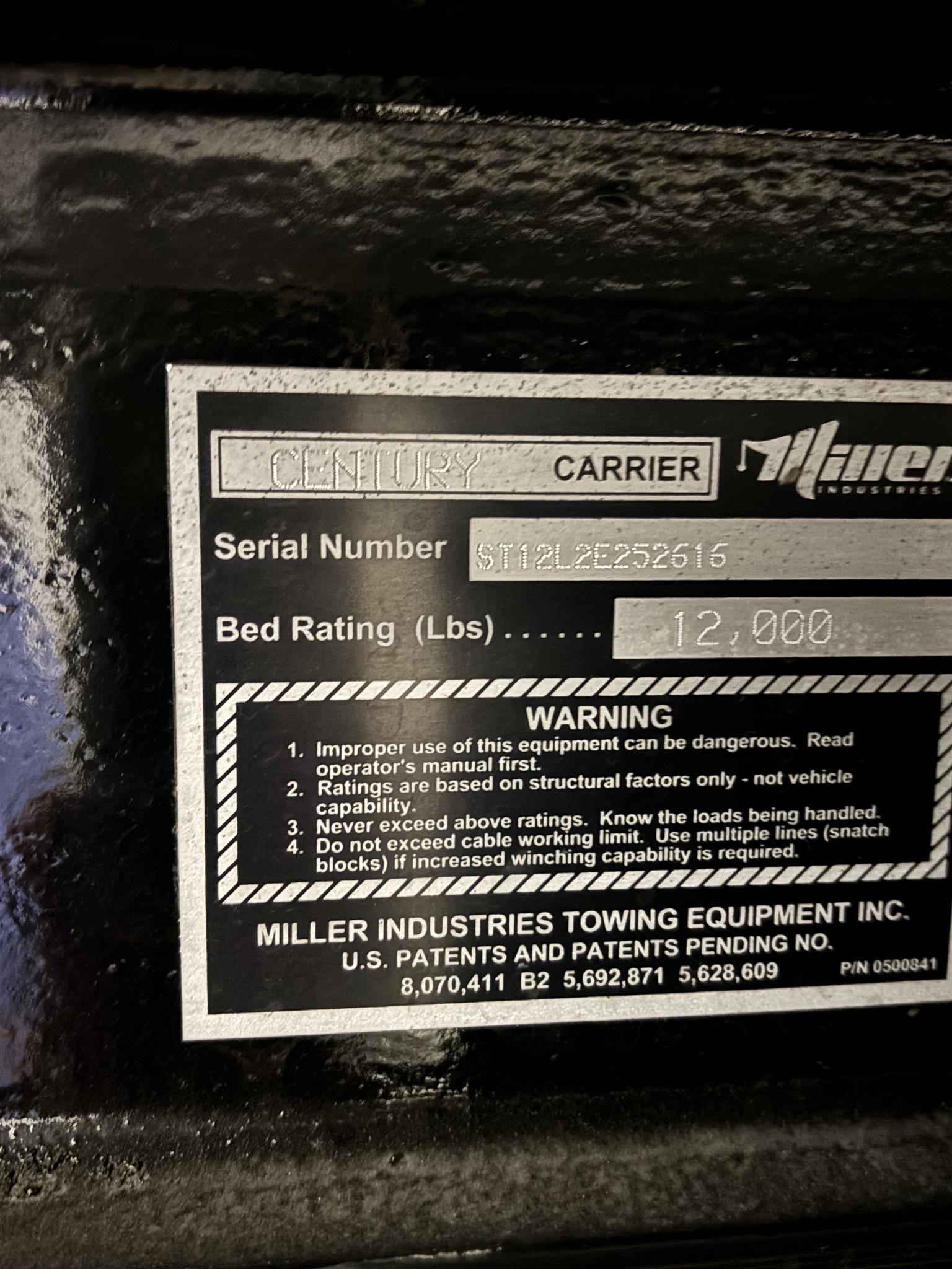 Century Steel LCG (Low Center of Gravity) Carrier w/ Wheel Lift, 3/16 Deck Plate, 3x2 Corten Tube Crossmembers on 8 inch Centers, (4) Rear Chain Locks, (2) Front Chain Locks, (6) Floor Plate Chain Locks (3 per side), 8,000lb Worm Gear Winch, 3/8" x 50' Winch Cable, Illuminated Dual Controls, FMVSS 108 Lamp Group Shock Mounted Lighted, Direct Mount Pump, Cable Roller Guide w/ Tensioner, Winch Free Spool Extension, Back-Up Alarm, (2) Safety Chains, Mechanical Anti-tilt, Black Body Paint, 102" Wide Body, Inboard Tilt Cylinders, Floor Level Roll Formed w/ Punched Stake Pockets, 4,000lb Wheel Lift w/ Releasable L Arms, Fully Hydraulic Wheel Lift, (2) Safety Straps & Ratchets, (2) Rear Safety Chains, Body Lock w/ Nylatron Toller Bearings, & 12,000lb Deck Load Rating. Body SN# ST12L2D251835