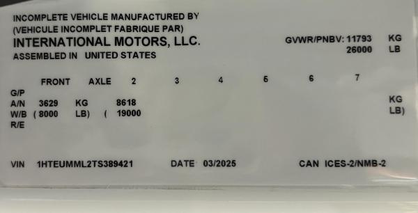 2026 International Model MV Extended cab. Cummins ISB 6.7L, 260HP @ 2,300 rpm, 660 lb-ft @ 1,600 rpm, Allison RDS-2200 6 Speed Auto, Air Brakes, Air Dryer Heater, Exhaust Brake, Front Axle: Dana-Spicer I-Beam 8,000lb w/ Shock Absorbers, Rear Axle: Dana-Spicer 19,000lb rear axle.. , 20,000lb Air Ride Suspension, 4.88 Rear Axle Ratio, Chrome Bumper, black Grille, Air Ride Driver Seat,& Passenger Seat, rear bench seat. Idle Up, Cruise Control, Tilt-Wheel, AM/FM/CD/MP3 w/ Bluetooth, Air Horn, Engine Block Heater, Dual 40-50 Gal Alum Fuel Tanks, 7 Gal DEF Tank, Power Windows, Power Door Locks, Power heated Mirrors. A/C, 255/70R22.5 Tires w/ 22.5 Alum Wheels, Cup holders.Visor 25,500 GVWR,Extended Warranties.- Engine Warranty: 5 yr / 300k miles PPI & after treatment, and Tranny Warranty: 7 yr / Unlimited Miles.