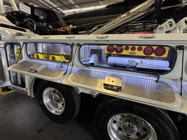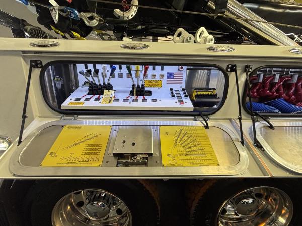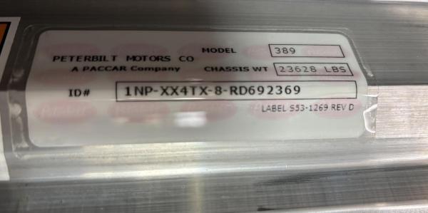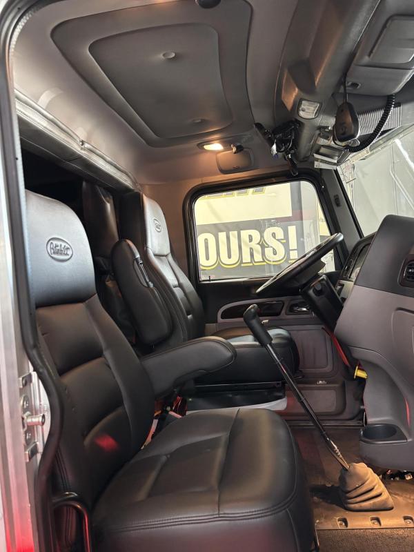 Pete 389 LONG HOOD> ISX15 605 HP 1950 Torque. Fuller RTLO16918B 18 Speed. .22,000 lb, 3.5in Drop,front axle. 23.000lb Front suspension. 26 in Aluminum 90 & 60 Gallon Fuel Tanks LH U/C, DEF Tank Small, Alum Cab 131in BBC Alum Hood SFFA, 10-3/4in Steel Rails 403-444in.Full Steel Inner Liner.Heavy-Duty Iron Front Spring Brackets Fwd & Rear.Dana Spicer 46,000 lb, Ratio 4.10 Rear Axle. Diff Lock Both Axles. SBM Valve. Synthetic Axle Lubricant All Rear Axles 52,000lbs,Neway 54in -Dual Leveling Valves Bendix AD-IS Air Dryer with Heater. Polished Alum Air Tanks Outside Frame Rails.Aluminum Space Saver Battery Box LH BOC.DPF Cab Entry Aluminum Non-Slip Step RH Under Cab. Heavy Duty External Tow Eye. Intebrake (Furnished on Engine).(2) 15in SS Air Cleaners, Cowl Mtd, SS Caps. Thermal Insulation Package in Cab.Thermal Insulation Pkg - Adjustable Steering Column - Tilt/Telescope.Leather Premium Steering Wheel with Multi Functions. Platinum Interior - Grey. Power Lift Windows - Both Doors. Combo Fresh Air Heater/Air Conditioner. Cup Holder (Floor Mounted).Outside Sunvisor Stainless Steel. Aero Mirrors Ea Side Htd & Mtrzd 4-Way Adjustable. (4) Air Horns Rect-(2) 26in & (2) 29in. ConcertClass Audio System with Bluetooth.. Bright Bezel Gauges ipo Black. Woodgrain dash optionMarker Lights (5) Bus LED Bullet. Fog Lights (2) Peterbilt. (1) 6in Spotlight Round Halogen LH. Suspension Pressure Gauge. Stainless Steel Gravel Guards. 10 Inch Extension for Ultra Day Cab. Air Disc brake package. Diff. Lock Tandem Axles with Speed Inte. RLOCK -Upgrade Clutch Torque Capacity. Peterbilt Keyless Entry, Platinum Interior - Arctic Gray, with SmartNav. Rubber Floor ipo Carpet (Black Only)., Cobra 40 Channel CB Radio w/Integral Speaker, Unibilt Cab Air Suspension. (2) Peterbilt Fog Lights. Sears Atlas 80 high-back ultra-leather seats, black, for Driver and Passenger. : Pusher axle Tire. (4) BR 14ply 285/75R24.5 M726ELA 2,679 540, Front tires.: MN 20ply 385/65R22.5 X Multiway HD XZE. RR: BR 16ply 11R24.5 M726ELA, (1) non-steerable pusher axle. 44" Sleeper, Stainless Steel sleeper vents. block heater..Texas-style steel Chrome bumper. Stainless Steel visor, Mid-level speaker option cab, and Sleeper. SMARTLING. 24 months sub. option RAMI Multi-band Attentas. Wheelbase 360" two-stage paint metallic Pearl 86,600 GVWR5-year, - 350K X15 PER/PRO Extended Engine Warranty.