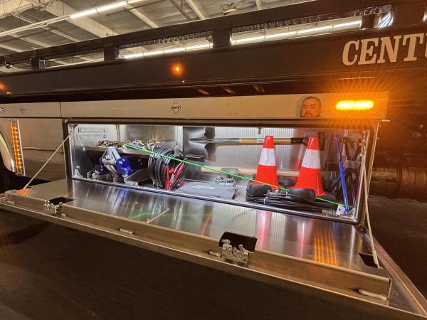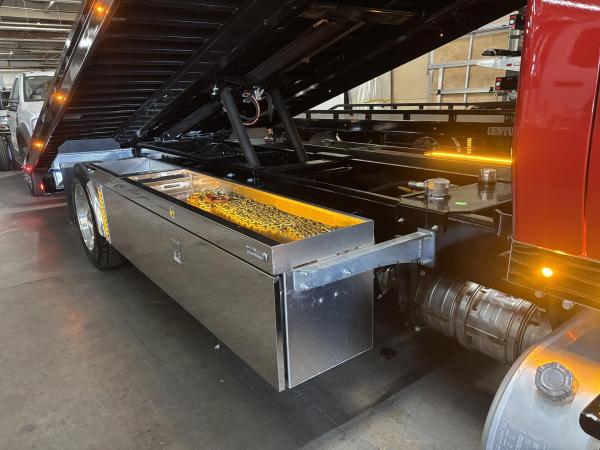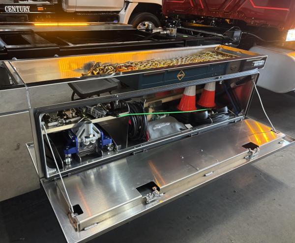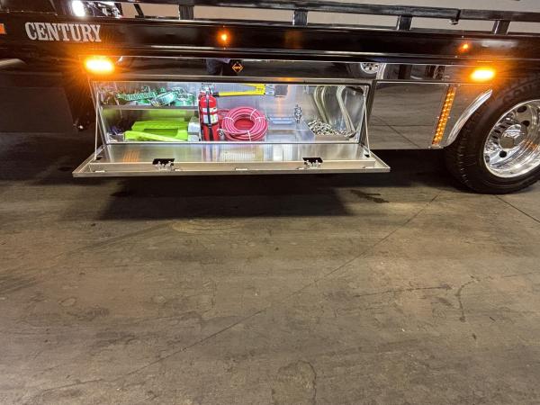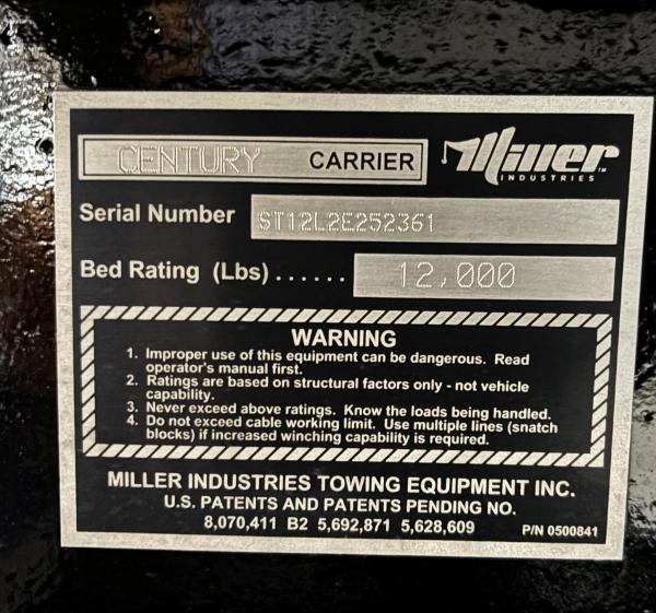 Century Steel LCG (Low Center of Gravity) Carrier w/ Wheel Lift, 3/16 Deck Plate, 3x2 Corten Tube Crossmembers on 8 inch Centers, (4) Rear Chain Locks, (2) Front Chain Locks, (6) Floor Plate Chain Locks (3 per side), 8,000lb Worm Gear Winch, 3/8" x 50' Winch Cable, Illuminated Dual Controls, FMVSS 108 Lamp Group Shock Mounted Lighted, Direct Mount Pump, Cable Roller Guide w/ Tensioner, Winch Free Spool Extension, Back-Up Alarm, (2) Safety Chains, Mechanical Anti-tilt, Black Body Paint, 102" Wide Body, Inboard Tilt Cylinders, Floor Level Roll Formed w/ Punched Stake Pockets, 4,000lb Wheel Lift w/ Releasable L Arms, Fully Hydraulic Wheel Lift, (2) Safety Straps & Ratchets, (2) Rear Safety Chains, Body Lock w/ Nylatron Toller Bearings, & 12,000lb Deck Load Rating. Body SN# ST12L2E252361