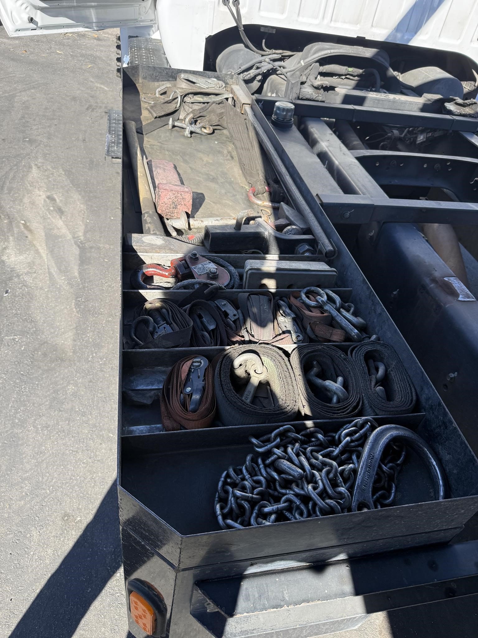Dual 78” steel toolboxes with SS skins, barn door. CHP and roadside service equipment, including jump cables and hot box as seen in pictures.