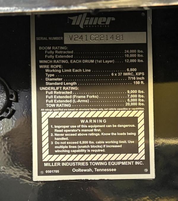 Vulcan - V-24 Boom, 12-Ton Retracted, 24,000 lbs., Extended, 10,000 lbs., Maximum Angle, 40°, Maximum Hook Height,147”, Maximum Reach past Tailboard Minimum Elevation,72”,Underlift,Fully Retracted (with Forks),9,000 lbs. ,Fully Extended (with Forks), 7,000 lbs., Extended or Retracted with L-Arms, 6,000 lbs., Underlift Reach to the Center of Fork Holder on the Ground, Retracted, 42”, Extended 76”, Positive Tilt, 28°, Negative Tilt, 12°, Tow Rating, 20,000 lbs., Winch Rating & Cable