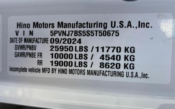 California Compliant:2025 Hino L-6 California Compliant - 260 HP Auto. Allison Automatic. Exhaust Brake, Air Brake package. 10,000lb front Axle 12K Front Suspension. 19,000lb Rear Axle, 5.13 Ratio. 52 52-gallon aluminum tank. 19,000lb Air suspension. Power Group, AM/FM Bluetooth.. Air ride driver seat. Single passenger seat. Rear Bench seat, cruise control, Idle up, chrome bumper -Aluminum wheels, Power Mirrors. Tilt wheel.. WB 22.5 25570R Tires. GVWR 25,950 149” CA ---- 5-year 300K Engine and After-treatment. 7-year unlimited -Allison Warranty-
