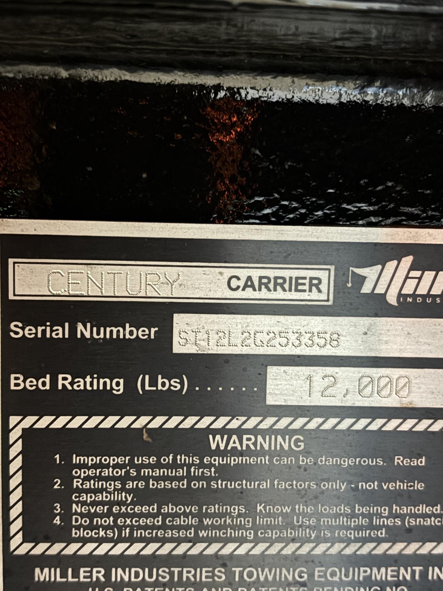 Century 21.5' Steel LCG (Low Center of Gravity) Carrier w/ Wheel Lift, 3/16 Deck Plate, 3x2 Corten Tube Crossmembers on 8 inch Centers, (4) Rear Chain Locks, (2) Front Chain Locks, (6) Floor Plate Chain Locks (3 per side), 8,000lb Worm Gear Winch, 3/8" x 50' Winch Cable, Illuminated Dual Controls, FMVSS 108 Lamp Group Shock Mounted Lighted, Direct Mount Pump, Cable Roller Guide w/ Tensioner, Winch Free Spool Extension, Back-Up Alarm, (2) Safety Chains, Mechanical Anti-tilt, Black Body Paint, 102" Wide Body, Inboard Tilt Cylinders, Floor Level Roll Formed w/ Punched Stake Pockets, 4,000lb Wheel Lift w/ Releasable L Arms, Fully Hydraulic Wheel Lift, (2) Safety Straps & Ratchets, (2) Rear Safety Chains, Body Lock w/ Nylatron Roller Bearings, & 12,000lb Deck Load Rating. Body Serial# ST12L2G253358