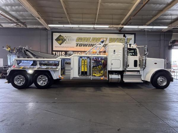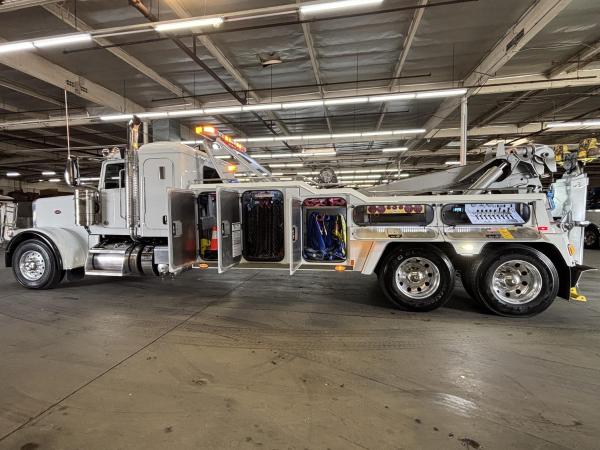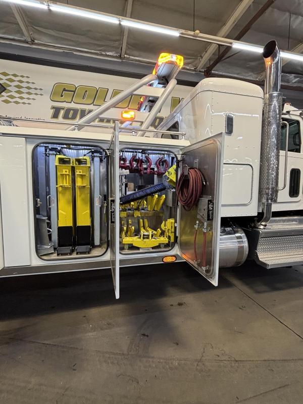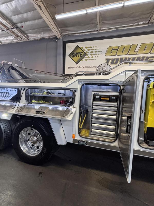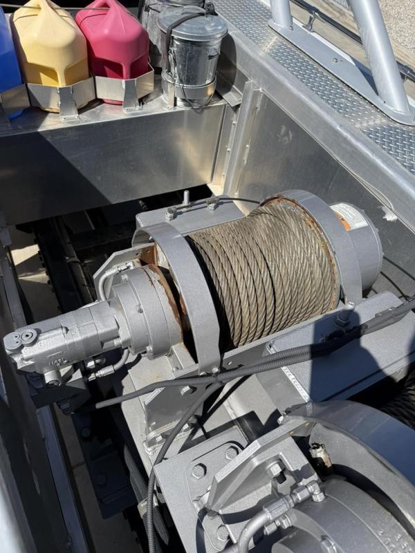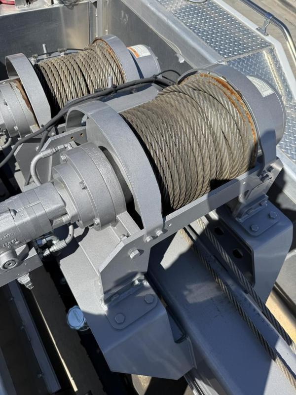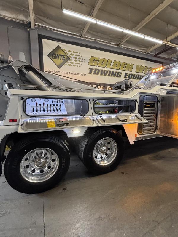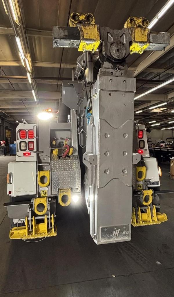 35-ton boom two-stage with power elevation, and power extension, with Dual 35,000lb Winches. 200' 3/4" 6 x 37 I.W.R.C. Air Cable tensioners. 360-degree Sheave head. Air free spool(winches). independent hydraulic rear spades. Pavement pads. 180" x 96" wide Body Aluminum Modular body. Dual control stations with direct link activation levers. Power Elevation & Extension.Hydraulic Fold. 3-Stage Design. Upper/Lower Thrust Washer. Tailboard recovery Anchors. Single grease fitting for the lubrication of the inner boom top pad. Spherical bearing in the main boom pivot. Dual pressure gauges. 70-degree pivoting Crossbar. One pair of Hook adapters. High Stands. King Pin lifting plate. Patented Power Tilt. I piece pivot pin. Low Profile Crossbar. Low Profile Fork adapters. One pair of Spring lift adapters. 6 pairs of lifting attachments. Fork holders. 9-way switch panel within the cab under lift controls. Air & electrical hookups. LED toolbox Lighting. Adjustable shelves. Dual chain racks. 2-section hydraulic pump. Tailboard “D” rings—aluminum treadplate walkway. Chrome double-action latches body, with keyless entry for toolboxes. Rubber isolators for body mounting. Safety chains in the rear pockets. Tailboard fork & chain storage. Full 15- 15-function remote lanyard controls the passenger side. SN# V-701G224770