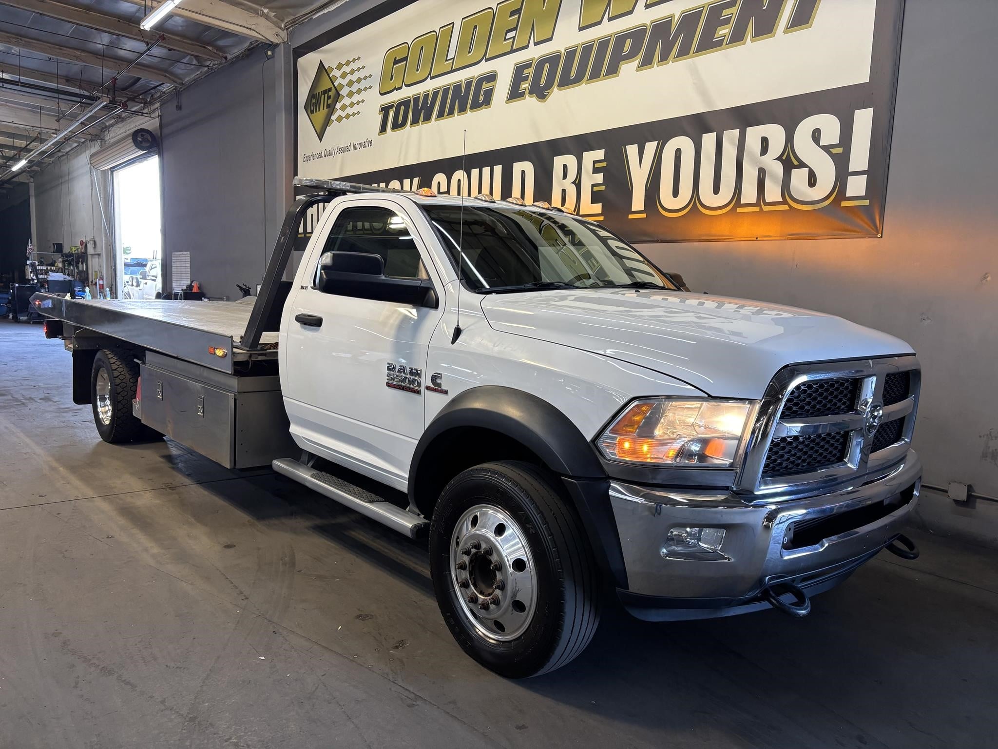 RAM 5500 SLT Reg Cab w/ Cummins 6.7L I-6 OHV Direct Diesel Injection, 24 Valve Intercooled Turbo, 325HP @ 3,000 rpm, 750 lb-ft @ 1,600 rpm, 136 amp Alternator, 6 Speed Automatic Aisin AS68RC, Exhaust brake. Engine Block Heater, 120" CA, 4 Wheel Disc Brakes w/ Front and rear Vented Discs, Non-Independent Front Suspension, Rear Leaf Suspension, 4 Wheel Anti-Lock Braking System, Daytime Running Lights, Dual Air Bags, A/C, 5" Touch Screen AM/FM/CD Radio, Cruise Control, Power Windows, Power Door Locks, 40-20-40 Split Bench Seat, Vinyl Black Material, Upfitter Switches (5). 19,500 GVWR, Chrome Cab Steps, 22 Gal Fuel Tank, 225/70R19.5 Tires w/ 19.5 Alum Wheels.