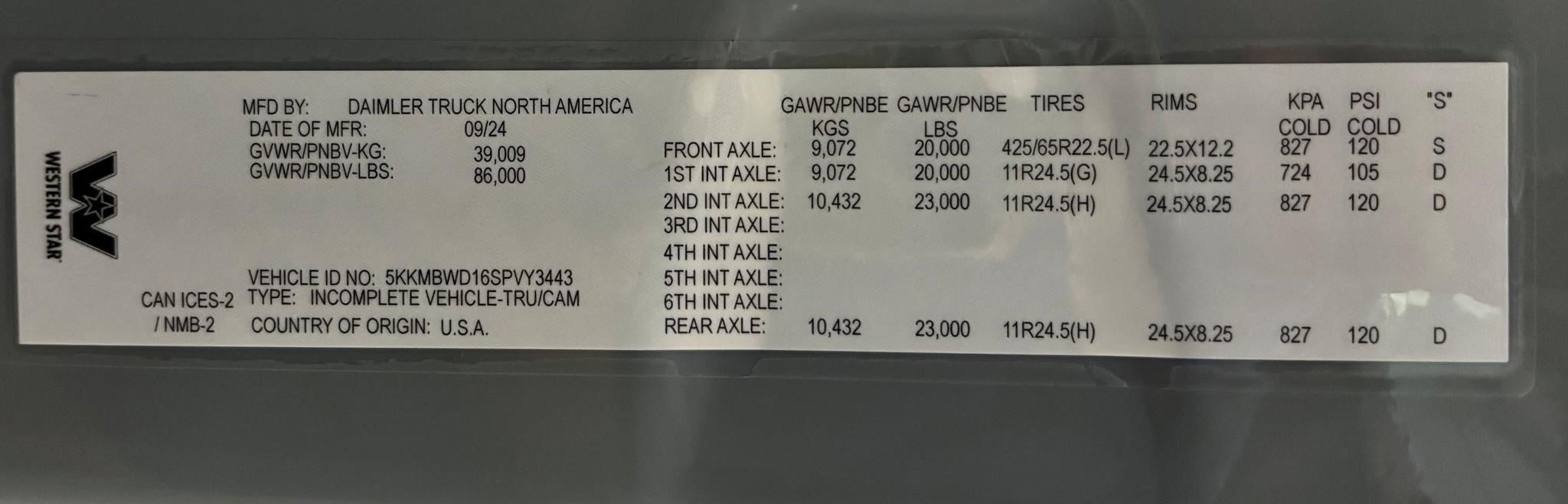 2025 Western Star 49X -121.5" BBC Aluminum Conventional cab. DETROIT DD16 15.6L 600 HP @ 1800 RPM, 2080 GOV RPM, 2050 LB-FT @ EATON FULLER RTLO-20918B Transmission, Jacobs C Brake 3 stage.